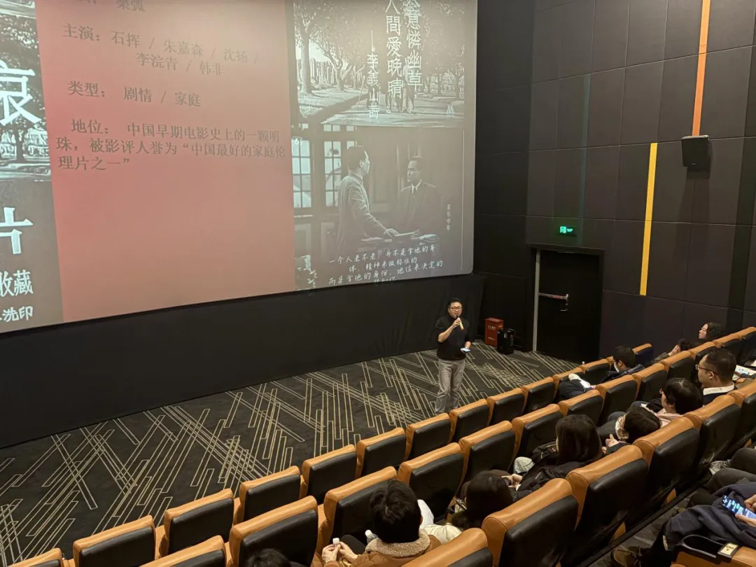 活动特别邀请甘肃省电影家协会理事、作家、影评人韩松落为观众带来精彩的映前导赏。他系统讲述了文华影业的创作历程及诸多经典作品,重点聚焦1949年出品的电影《哀乐中年》,深入解读了影片创作的社会背景,以及片中对生命价值的超前思考。同时,他还梳理了导演桑弧与男主角石挥的创作历程,展现了主创团队的艺术积淀。导赏尾声,韩松落提及影片中“中国人重死轻生”的经典台词,将影片探讨的中年价值命题与当下现实共鸣相结合,在温情氛围中为映后交流埋下伏笔。